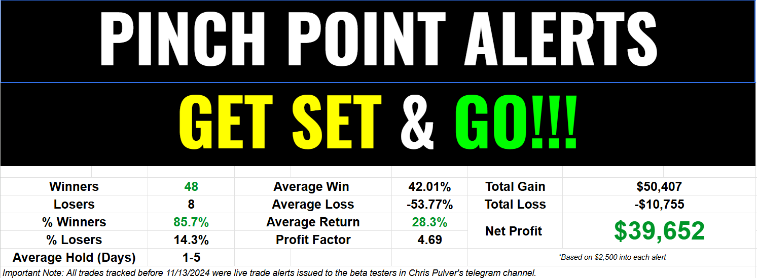 *We develop tools and strategies to the best of our ability, but no one can guarantee the future. There is always a risk of loss when trading. Past performance is not indicative of future results. While we have been using the Pinch Point Scanner with great success, we cannot guarantee any future results. What you will see today are some of the best examples over the last few months. There were bigger winners, there were smaller winners, and there were losers. Since the Pinch Point Scanner is a tool for traders and not a trading service, profits and performance will vary among users.