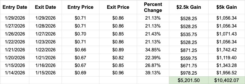 Disclaimer: We develop tools and strategies to the best of our ability but no one can guarantee the future. There is always a risk of loss when trading. Past performance is not indicative of future results. From 10/02/24 to 01/29/26, the average win rate was 80.2% on live published trades. The average return on options trades was 1.95 % over a one-day hold time, with an average winner of 23.88%